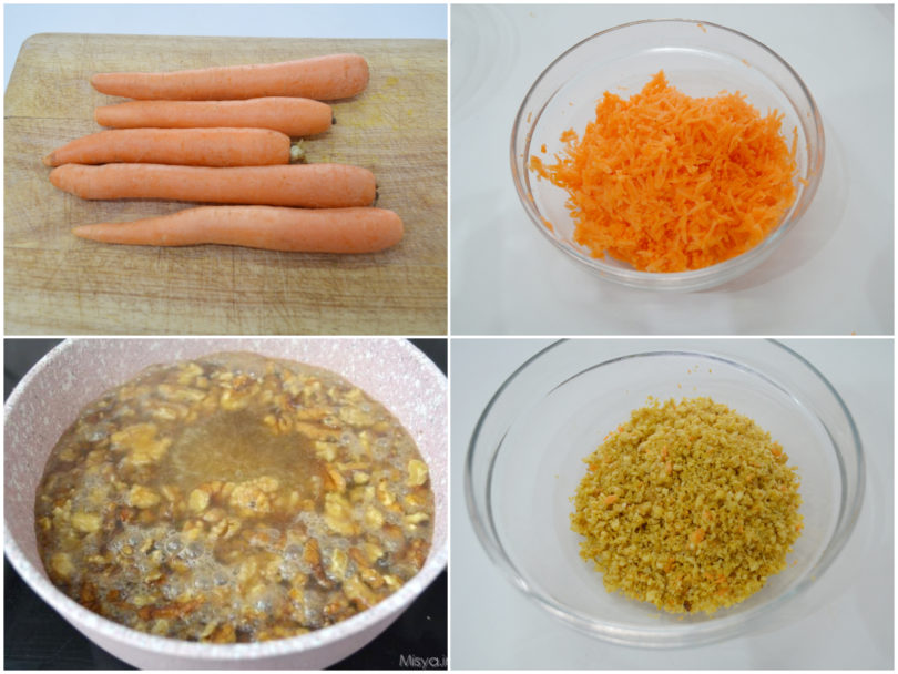 Pelare le carote e grattugiatele finemente. Sbollentate per un paio di minuti le noci, in modo da eliminate il sapore amarognolo, quindi tritatele grossolanamente.