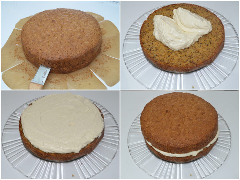 Una volta raffreddata la torta, tagliarla orizzontalmente ottenendo così 2 dischi. Spalmare un terzo della glassa ottenuta su un disco di torta e ricoprire con l'altro.