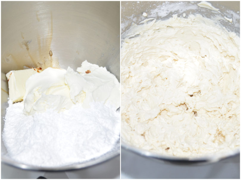 Nel frattempo preparare la glassa al formaggio lavorando con una frusta, la Philadelphia, il burro ammorbidito, lo zucchero a velo e l'essenza di vaniglia.