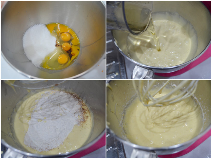 In un'ampia ciotola montare uova con lo zucchero e la vaniglia per una decina di minuti,  fino a renderle spumose.Unire l'olio a filo all'impasto