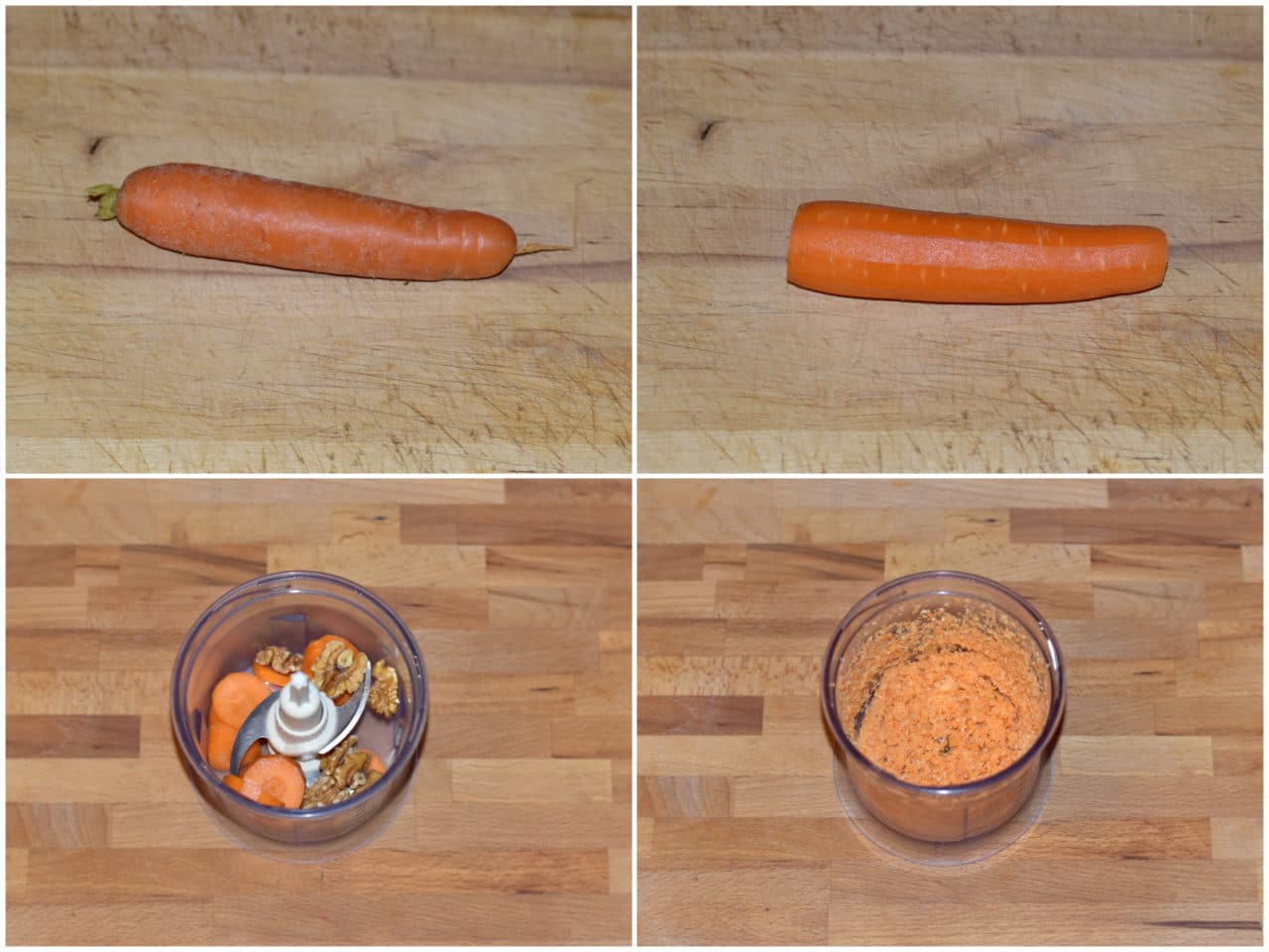 Mondate la carota, lavatela, tagliatela a pezzi e frullatela insieme alle noci.
