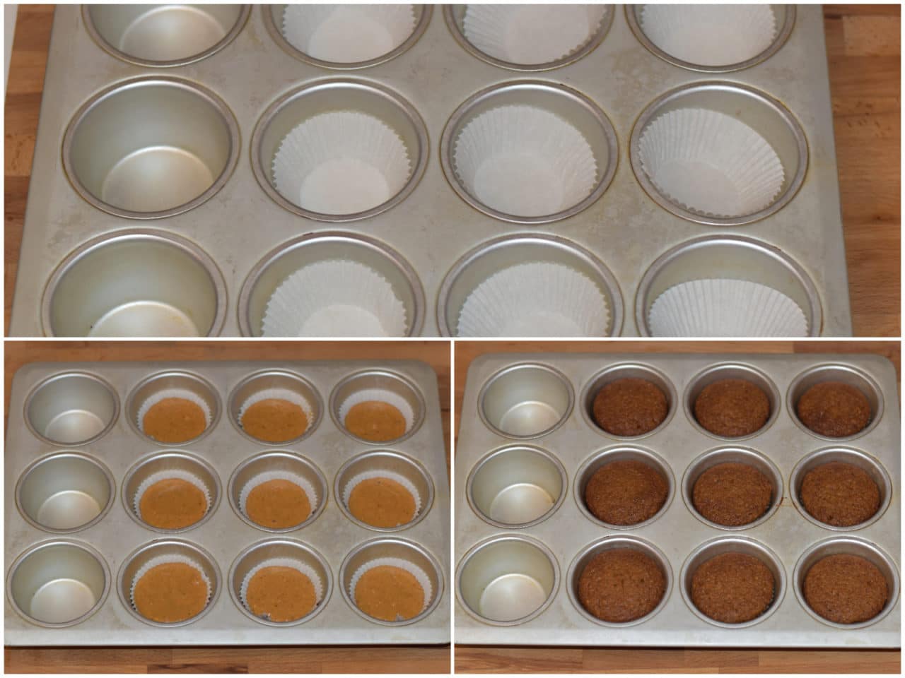 Versate il composto negli stampini rivestiti di pirottini di carta e cuocete per circa 20 minuti in forno statico preriscaldato a 180°C (fate sempre la prova stecchino, ma non aprite il forno prima di almeno 15 minuti).