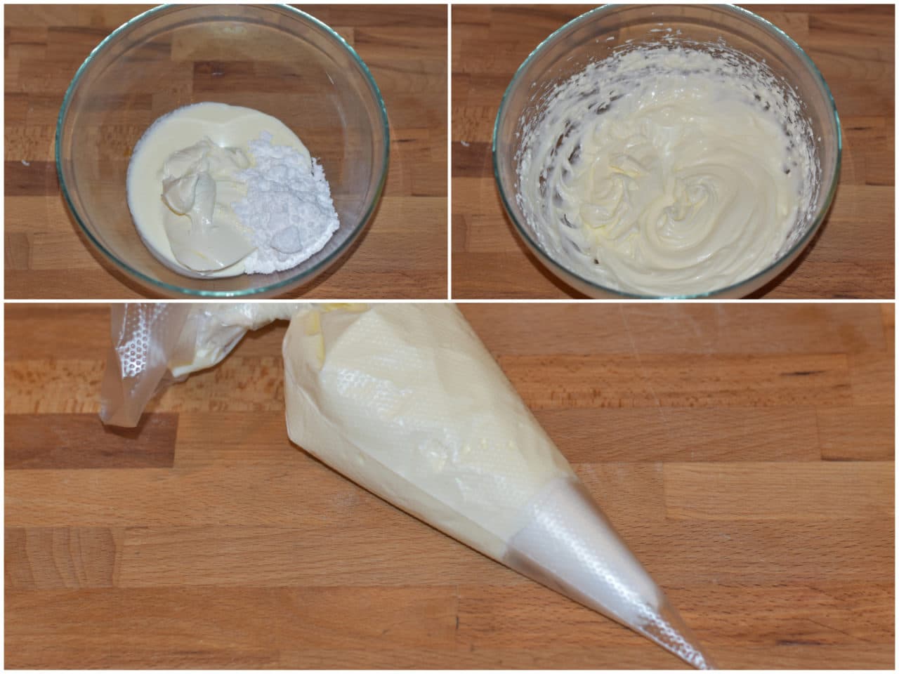 Preparate la glassa al formaggio: mettete in una ciotola Philadelphia e panna ben freddi di frigo, unite lo zucchero e montate velocemente con le fruste.