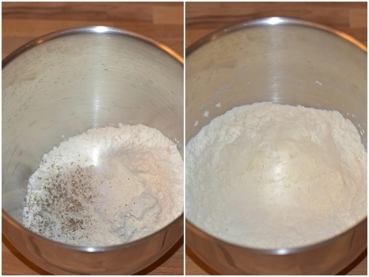 Innanzitutto preparate l'impasto: mettete in una ciotola farina, sale e pepe e mescolate.