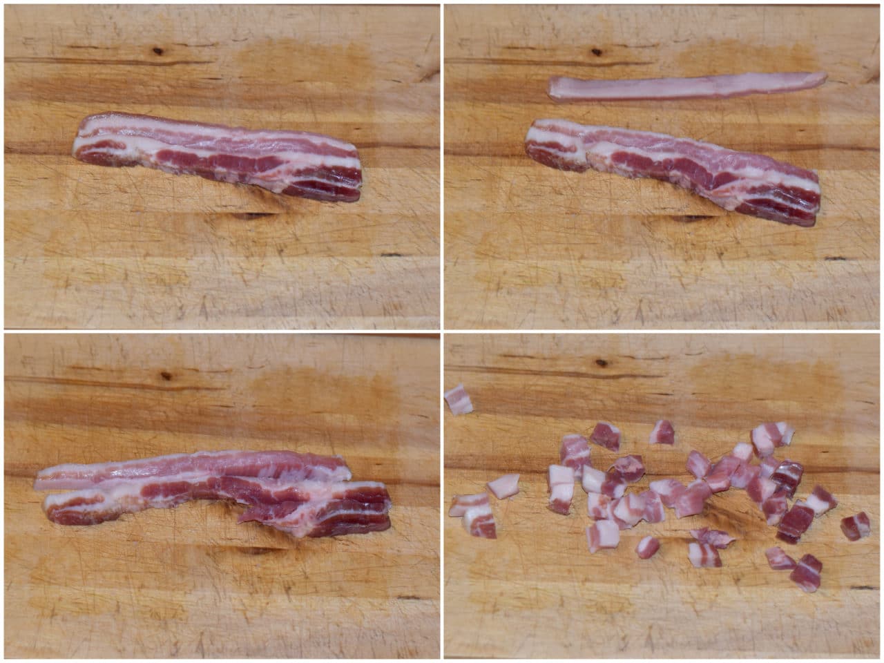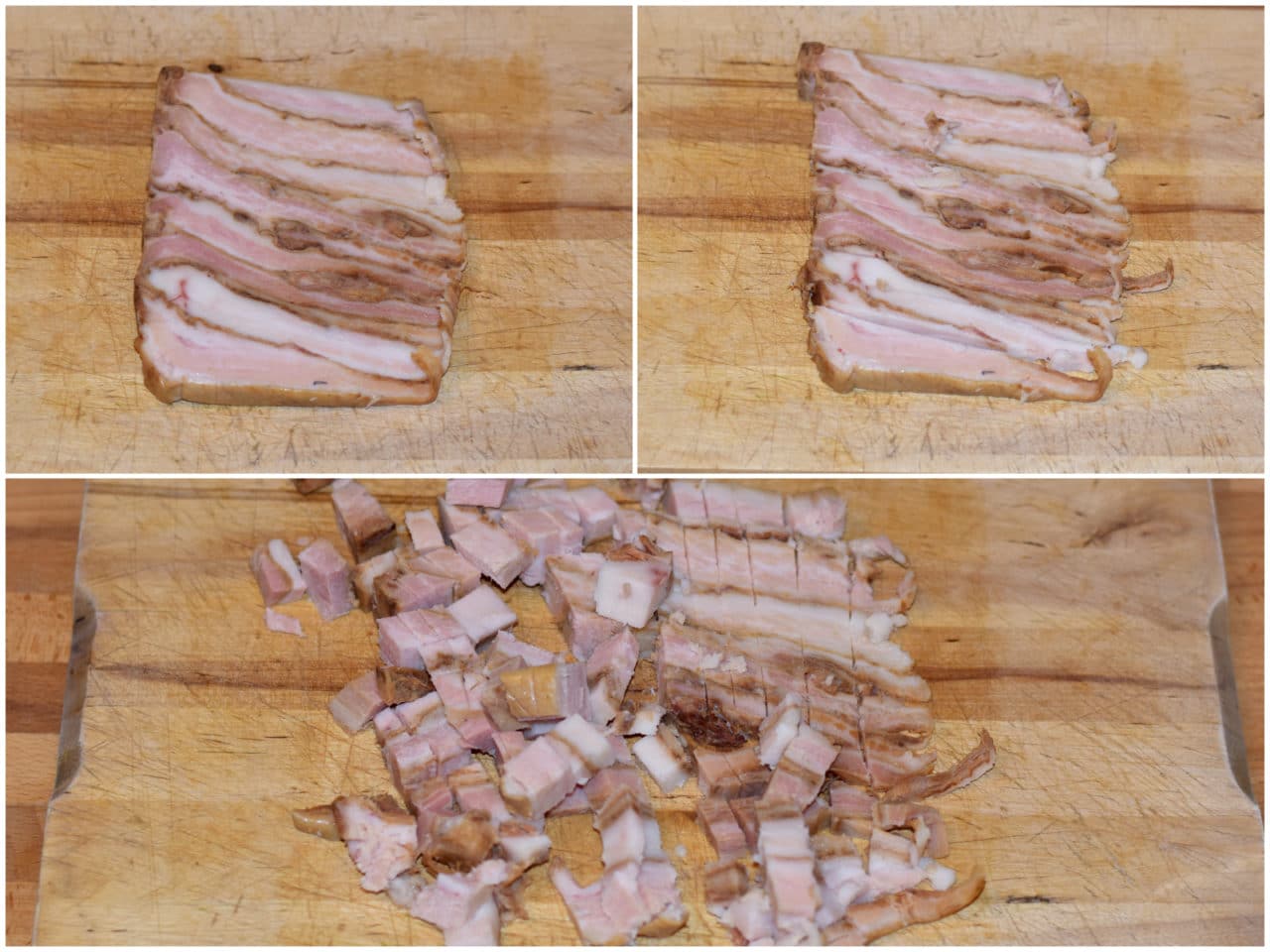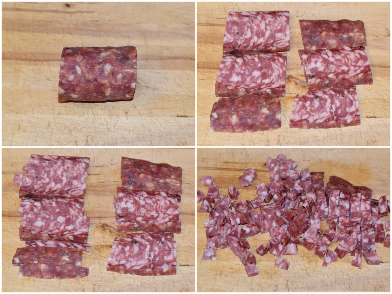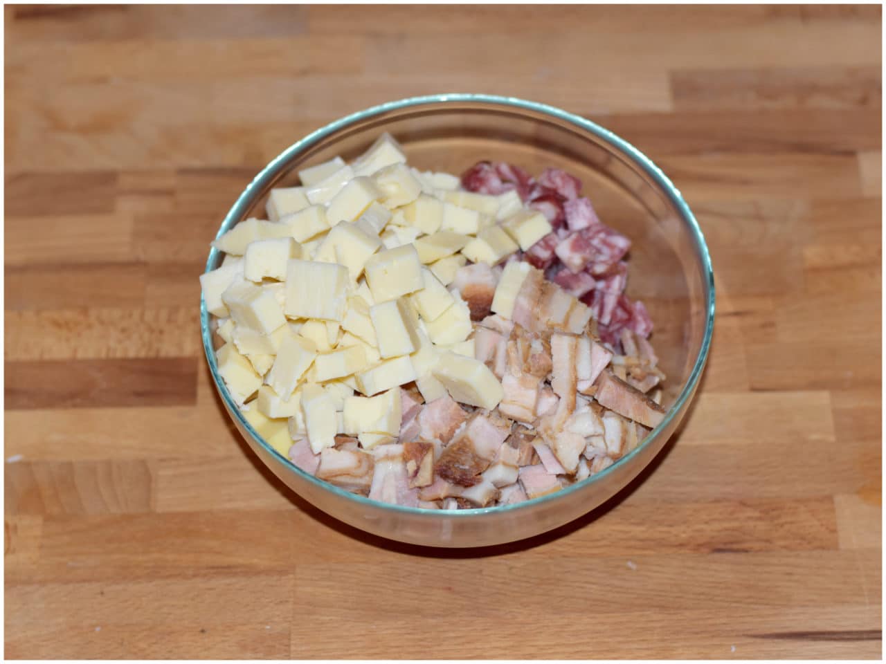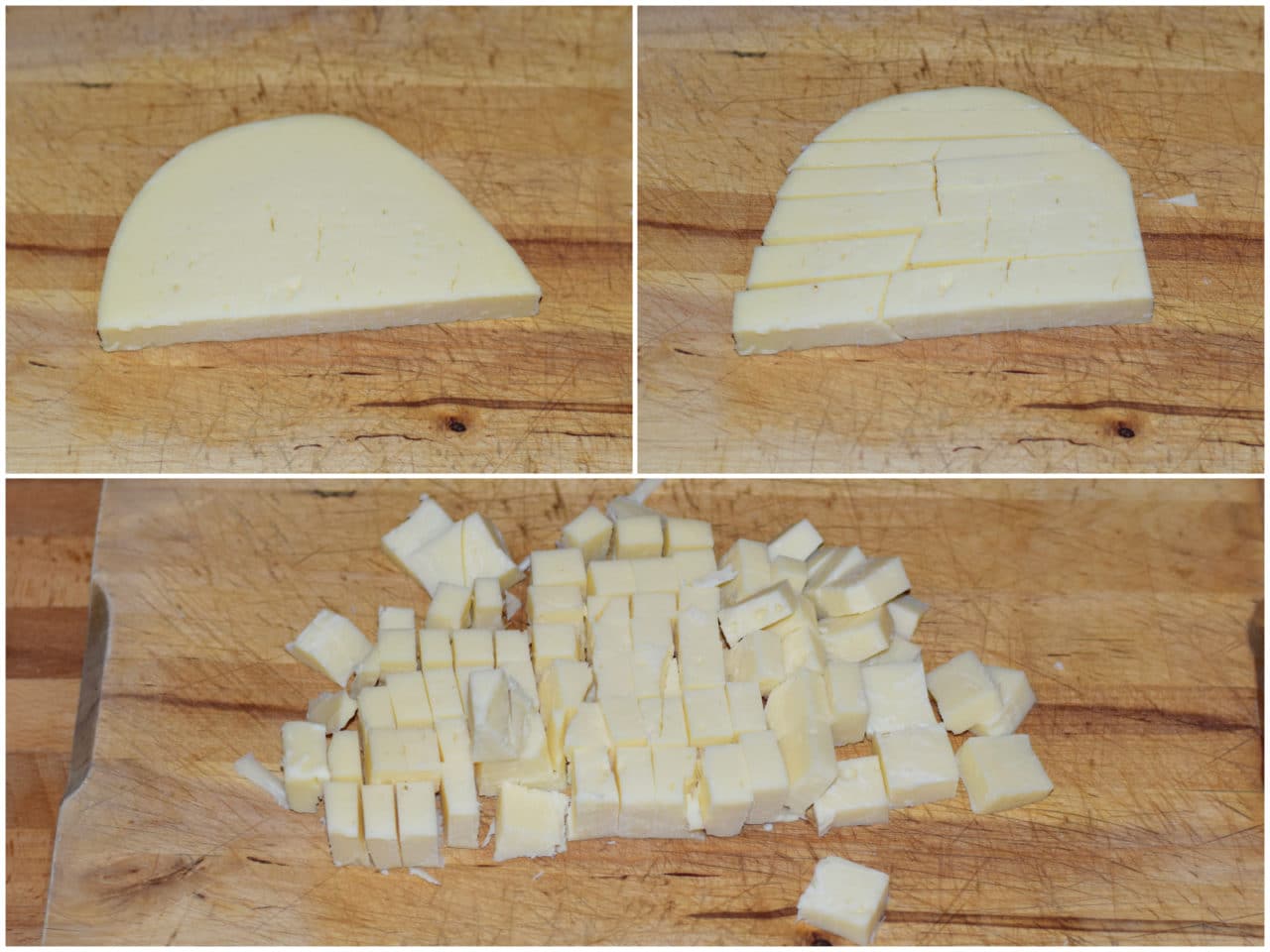 Tagliate anche il formaggio a dadini e unitelo ai salumi.