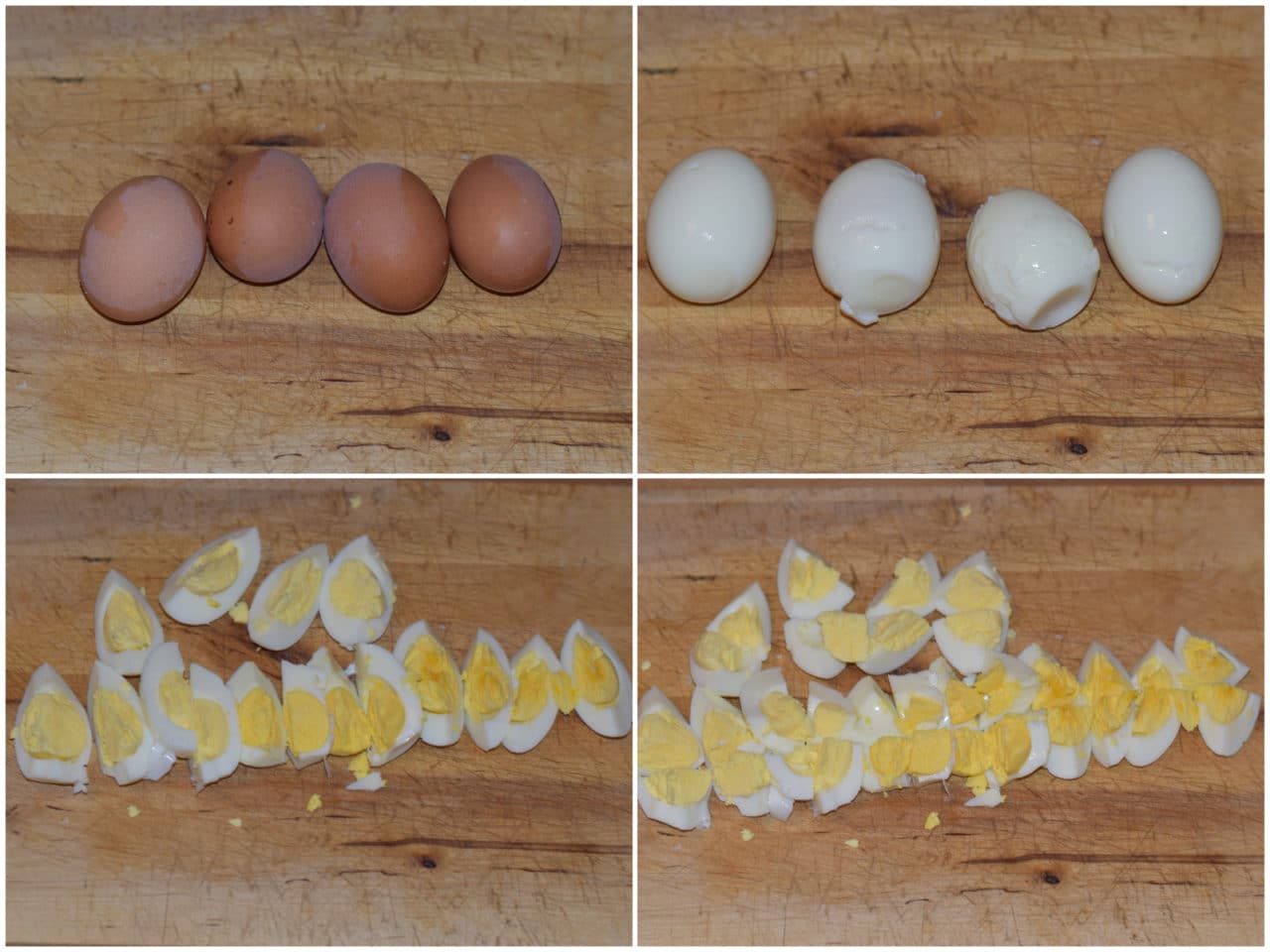 Sgusciate le uova e tagliatele in spicchi e poi a metà.