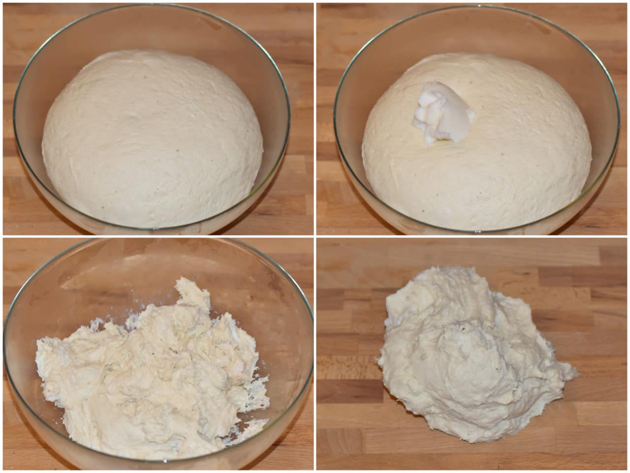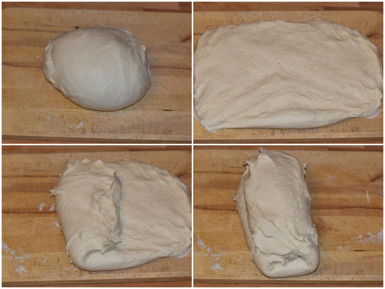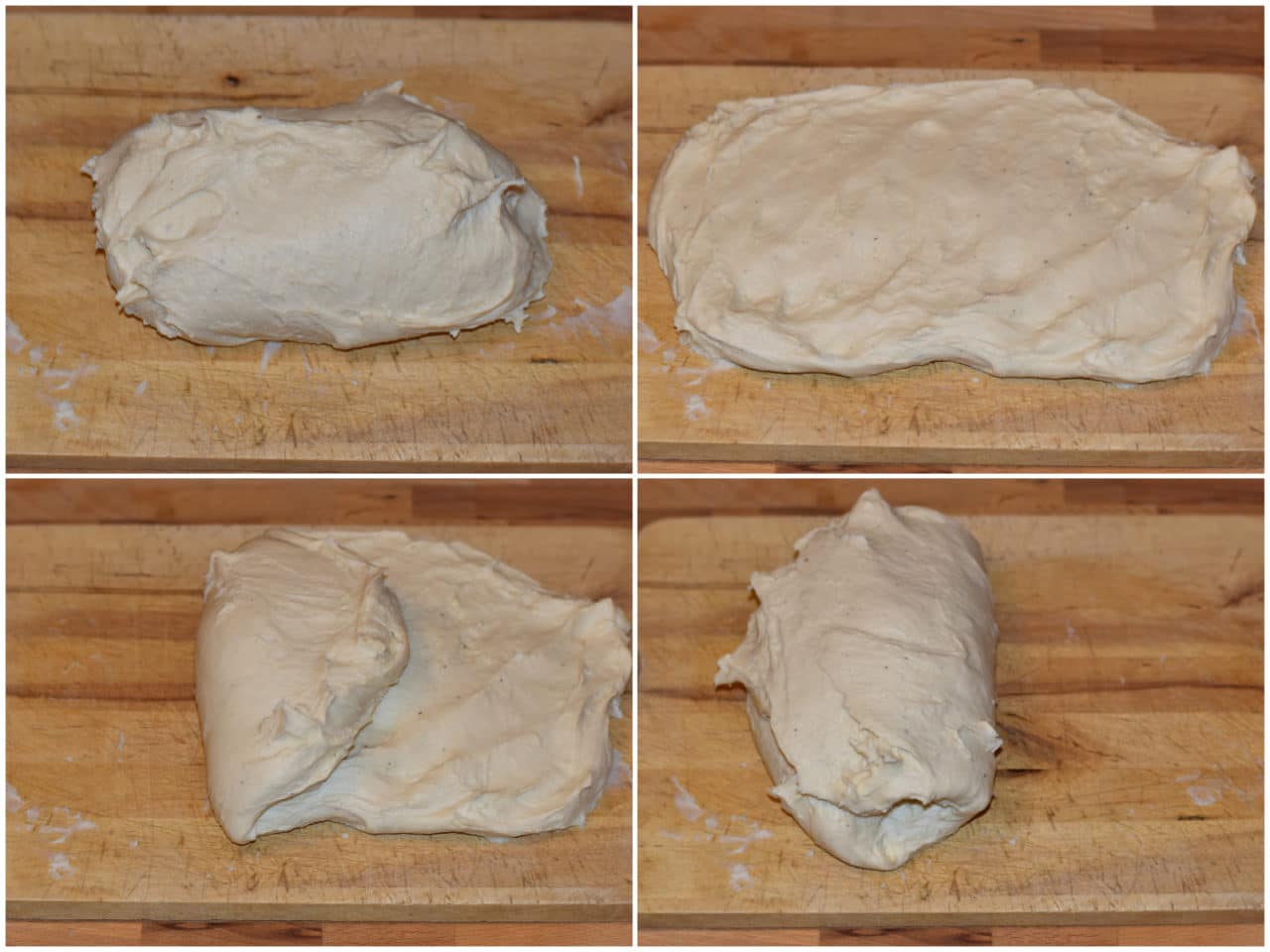 Trasferite l'impasto sul piano di lavoro ed eseguite 3 giri di pieghe (qui la guida per farlo al meglio).