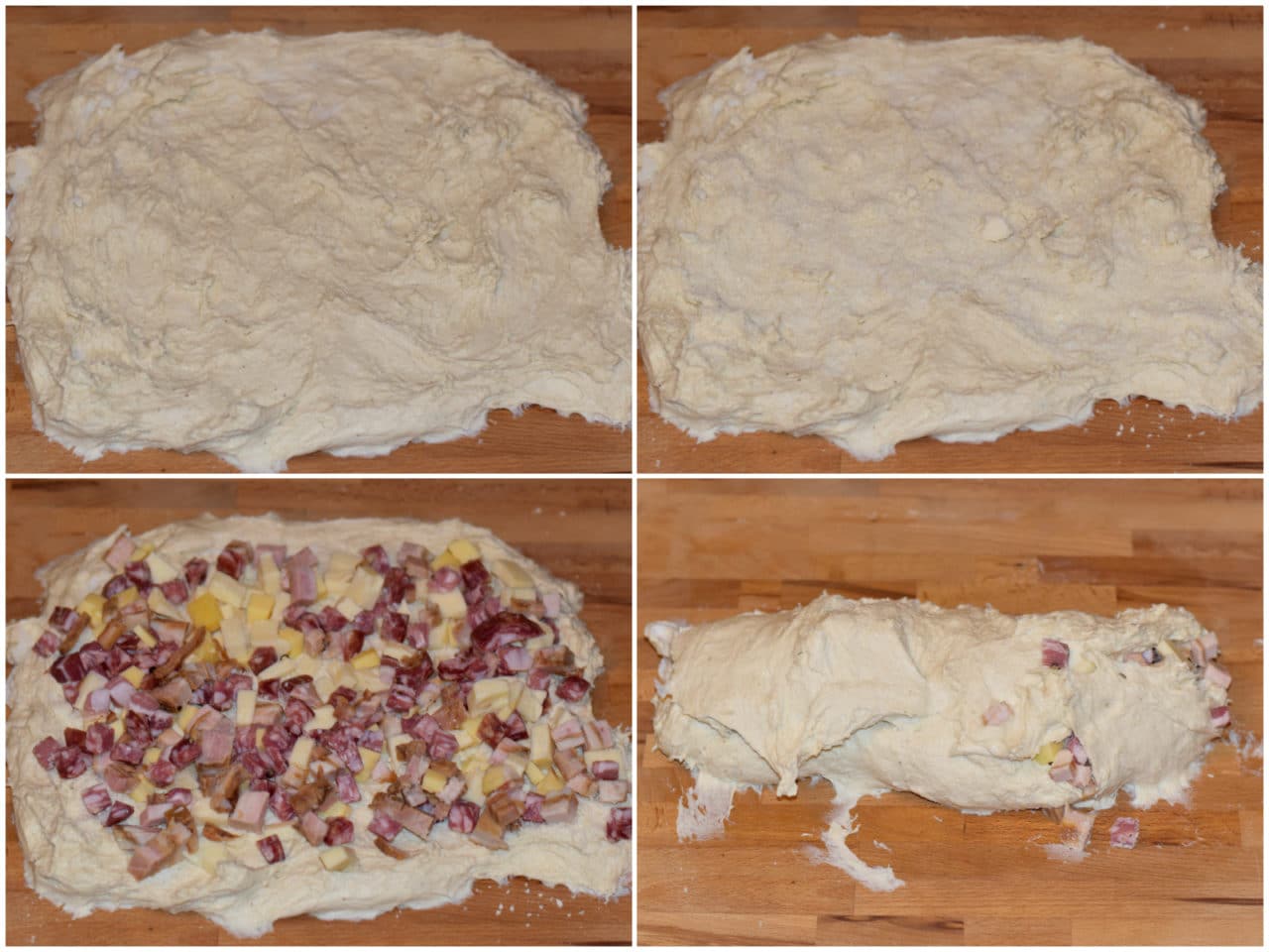 Cospargete il misto di salumi e formaggio a dadini sull'impasto, quindi, sempre con la mani unte di strutto, impastate per distribuire bene la farcia.