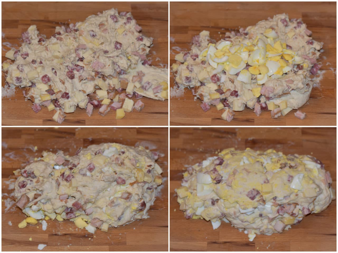 Aprite nuovamente l'impasto e aggiungete anche le uova e i formaggi gratugiati.