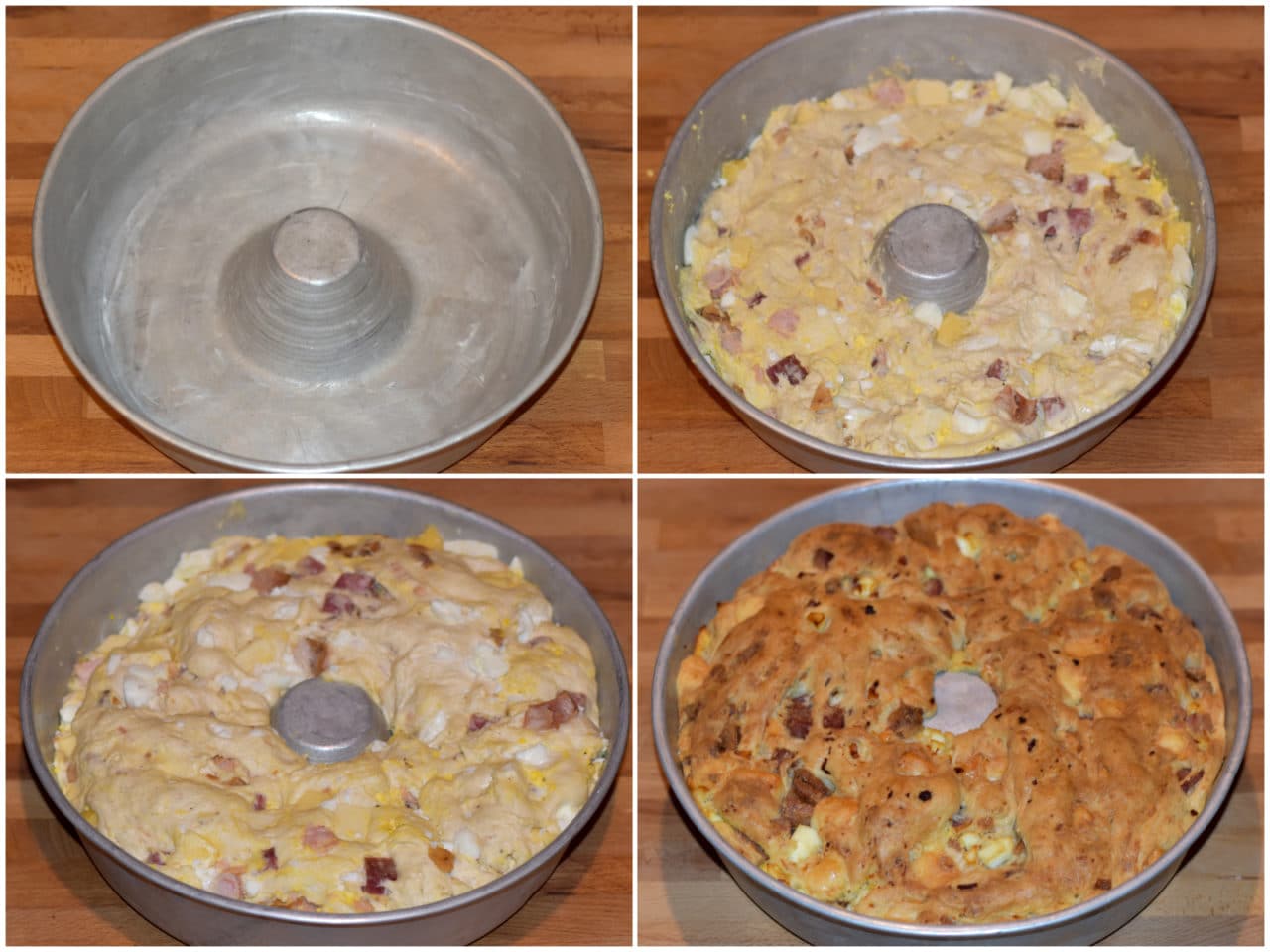 Distribuite l'impasto farcito nello stampo imburrato, coprite nuovamente con pellicola e lasciate lievitare finché non sarà arrivato quasi al bordo dello stampo, poi cuocete per circa 50 minuti in forno ventilato preriscaldato a 180°C.