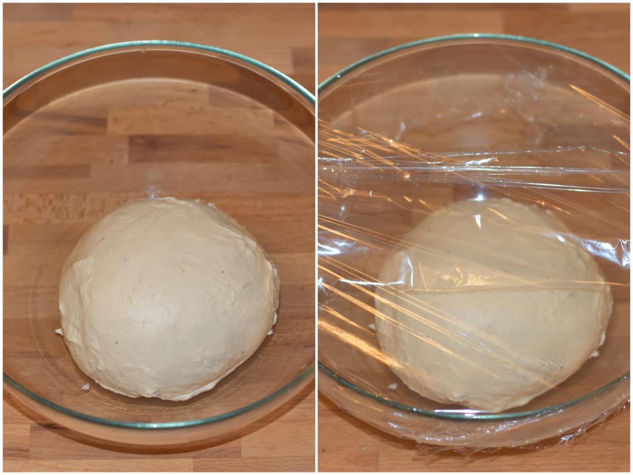Mettete il panetto così formato in una ciotola, chiudete con pellicola per alimenti e lasciate lievitare fino al raddoppio del volume (ci vorranno un paio d'ore circa).