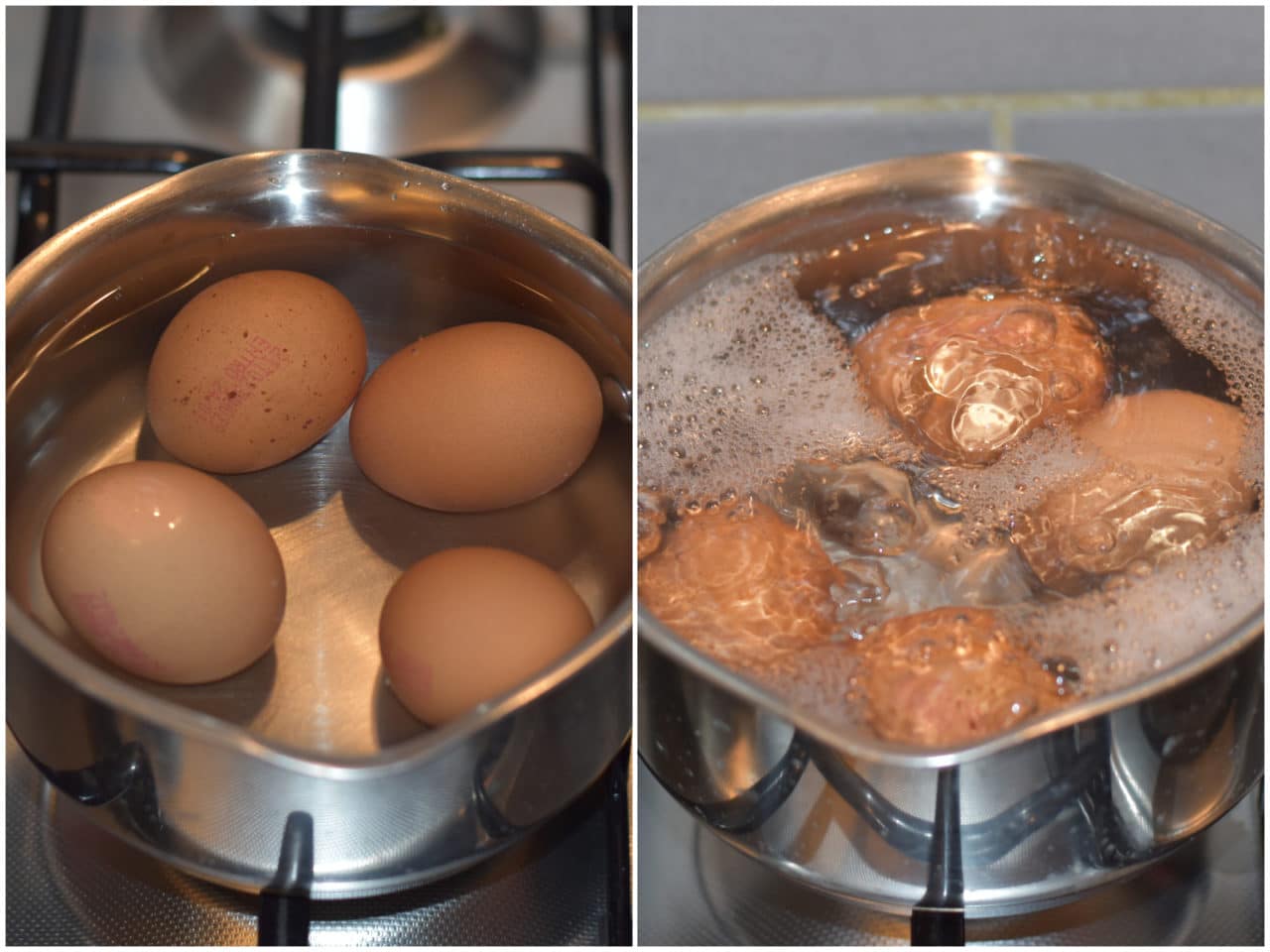 Prima che l'impasto sia pronto predisponete gli ingredienti per la farcia: bollite le uova per renderle sode (circa 8 minuti dall'ebollizione).