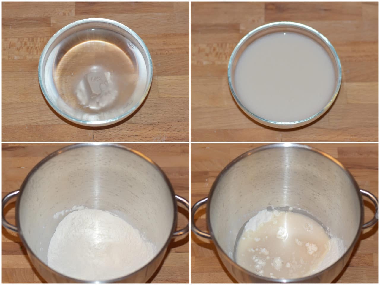 Innanzitutto sciogliete il lievito nell'acqua appena intiepidita, poi incorporate alla farina precedentemente mescolata con il sale.