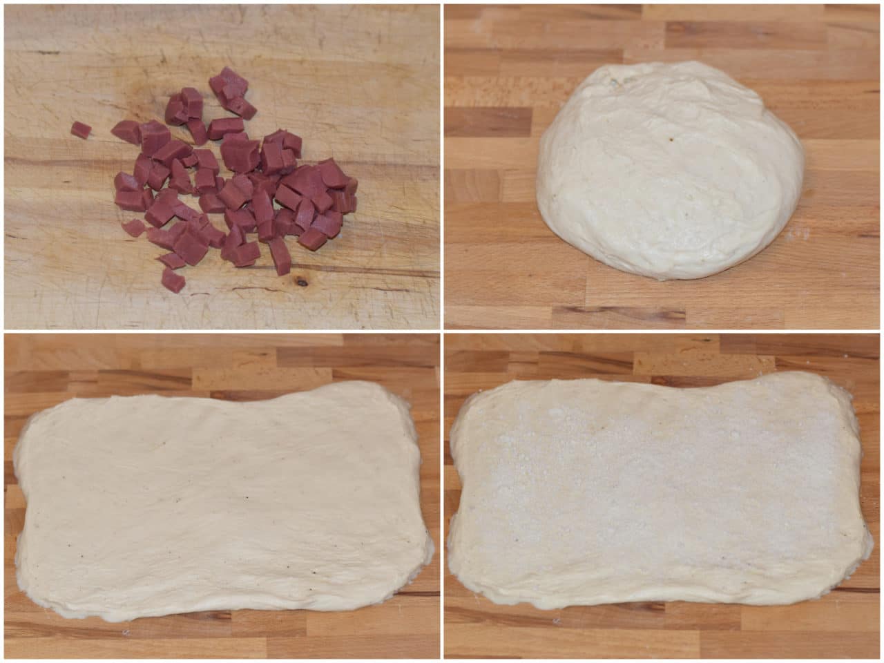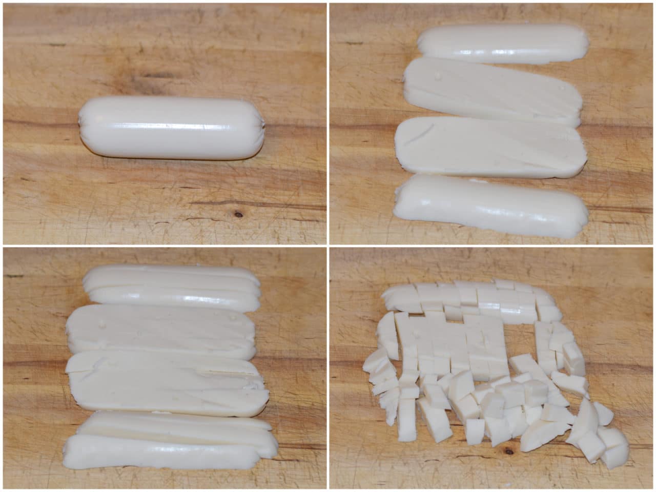 Nel frattempo preparate la farcitura, tagliando a cubetti salume e formaggio.