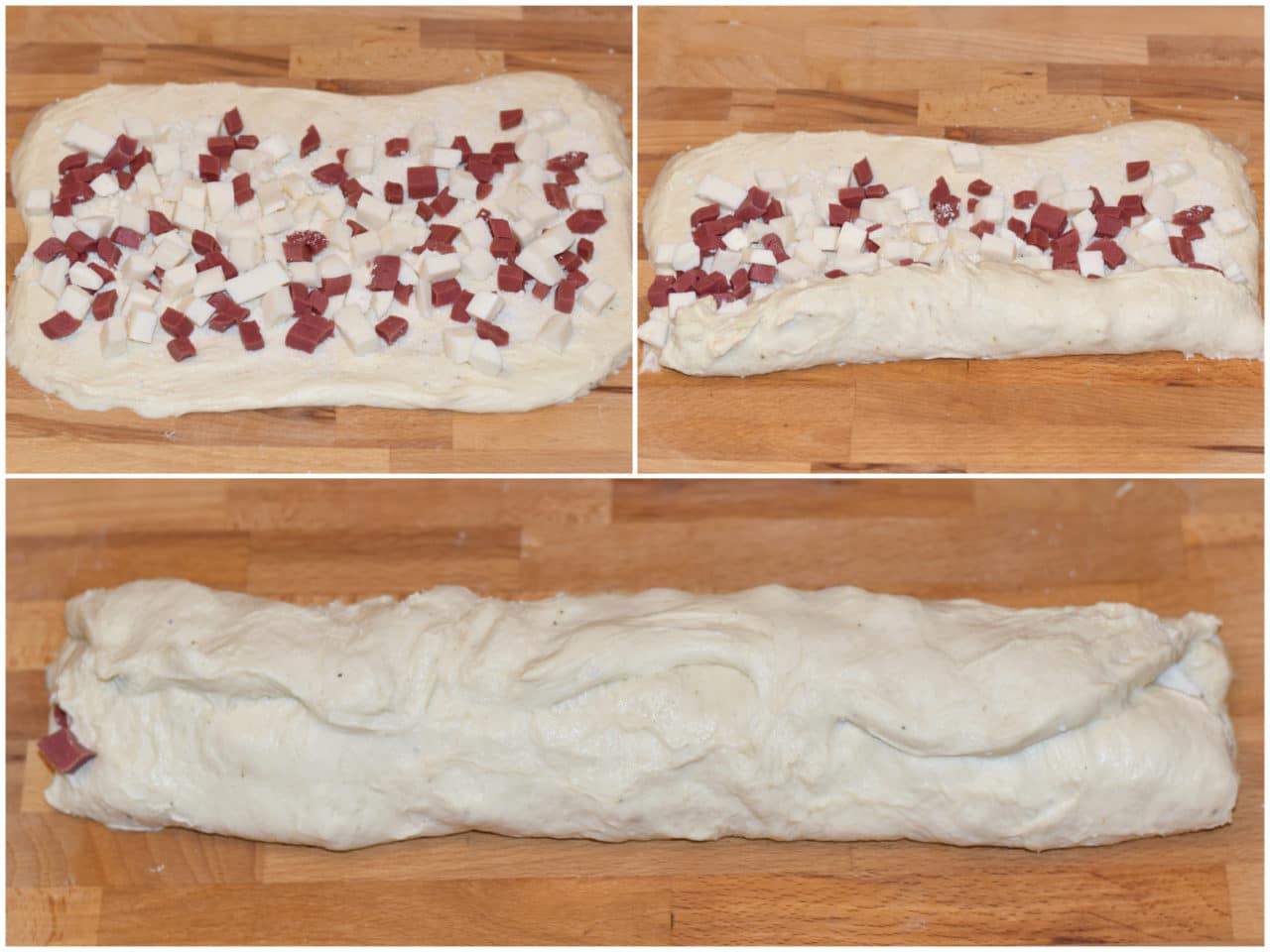 Stendete l'impasto in una sfoglia rettangolare alta circa 1 cm, cospargetelo con la farcitura, poi arrotolate partendo dal lato lungo.