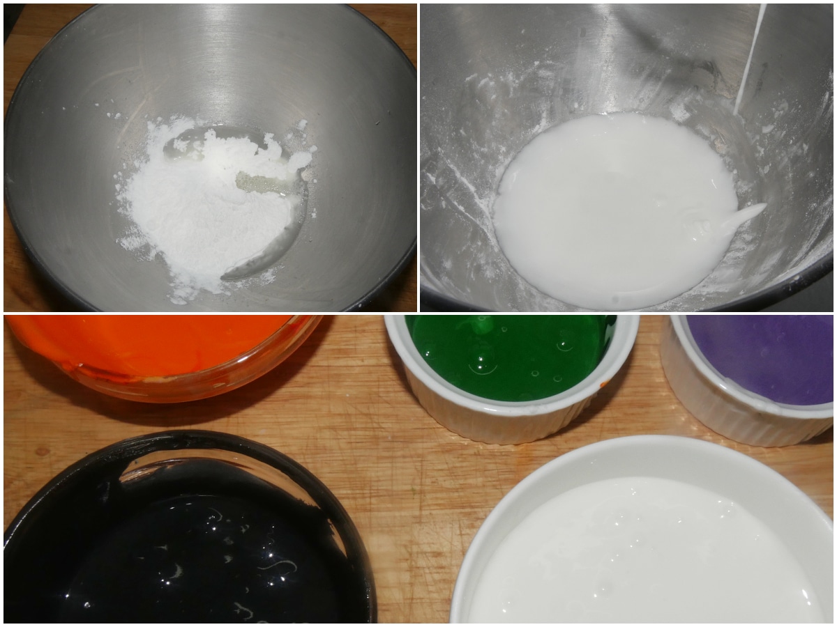Dividete la glassa in varie ciotoline per prepararla in diversi colori con i coloranti alimentari che avete scelto (io ho usato nero, arancione, viola e verde).