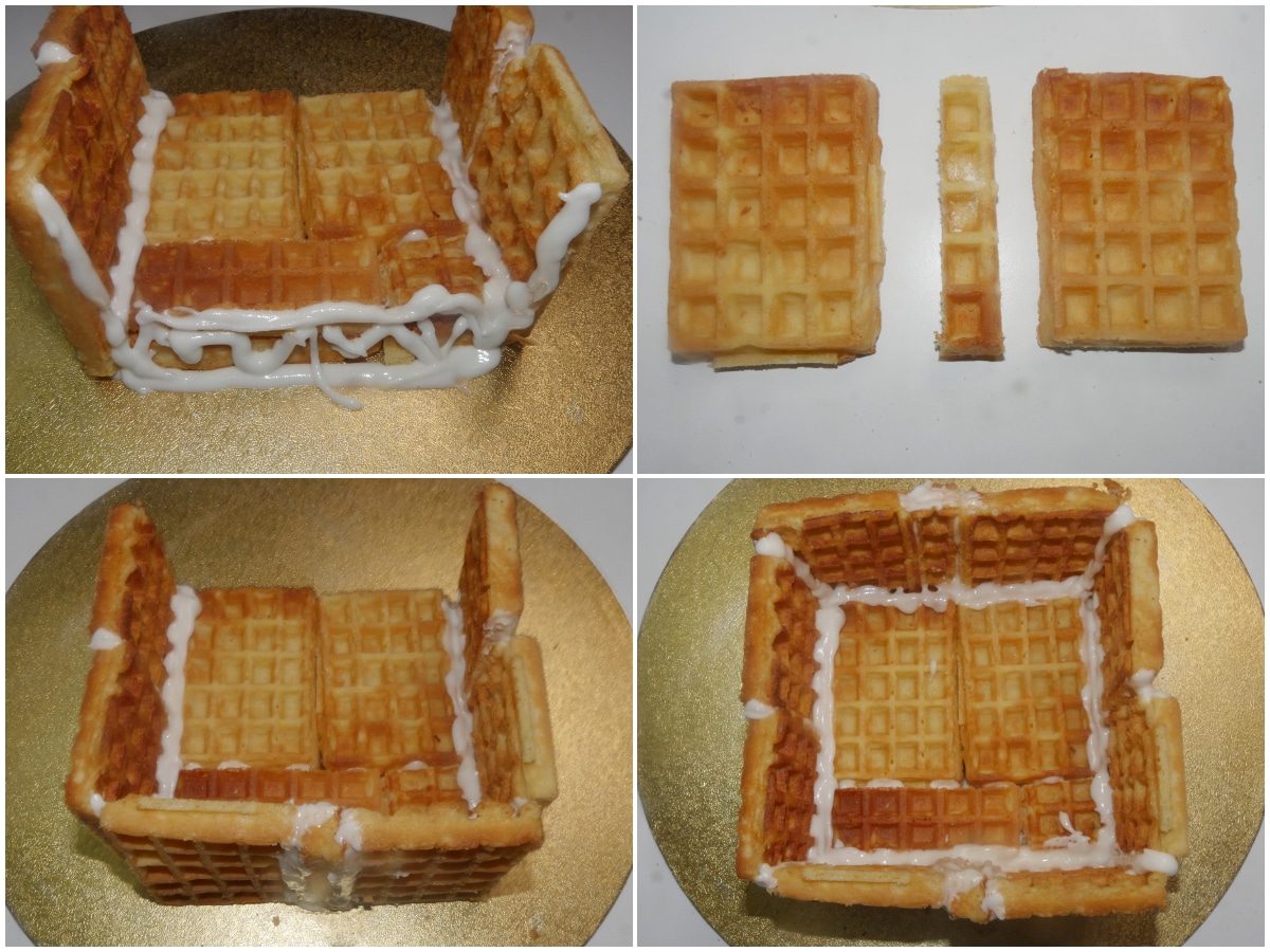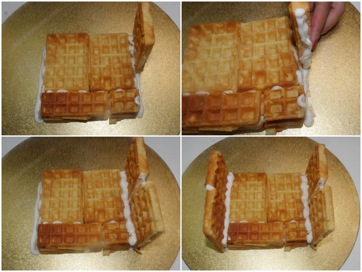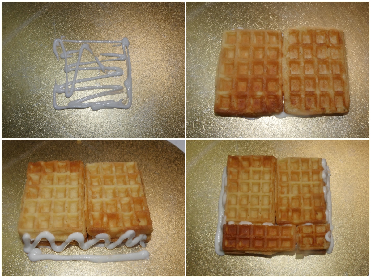 Mettete un pochino di glassa sul vassoio in modo da tenere ferma la composizione, poi disponeteci sopra i waffle in modo da creare un quadrato (il mio è da 8x7 rettangolini, dipende dalle dimensioni dei waffle), incollandoli anche tra di loro con la ghiaccia.