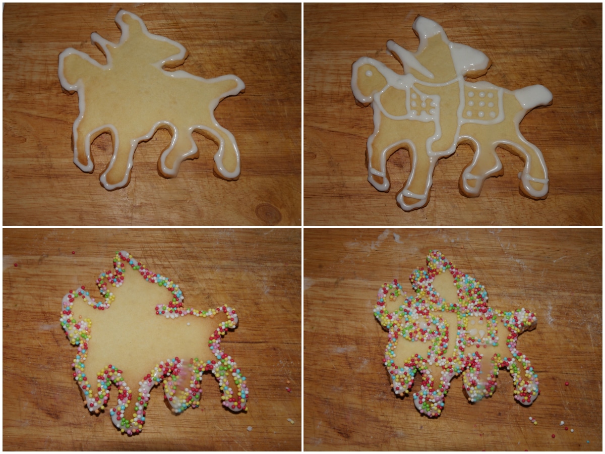 Decorate il biscotto con la glassa, delineandone contorni e dettagli, e coprendo poi la glassa con le codette di zucchero, quindi lasciate solidificare.