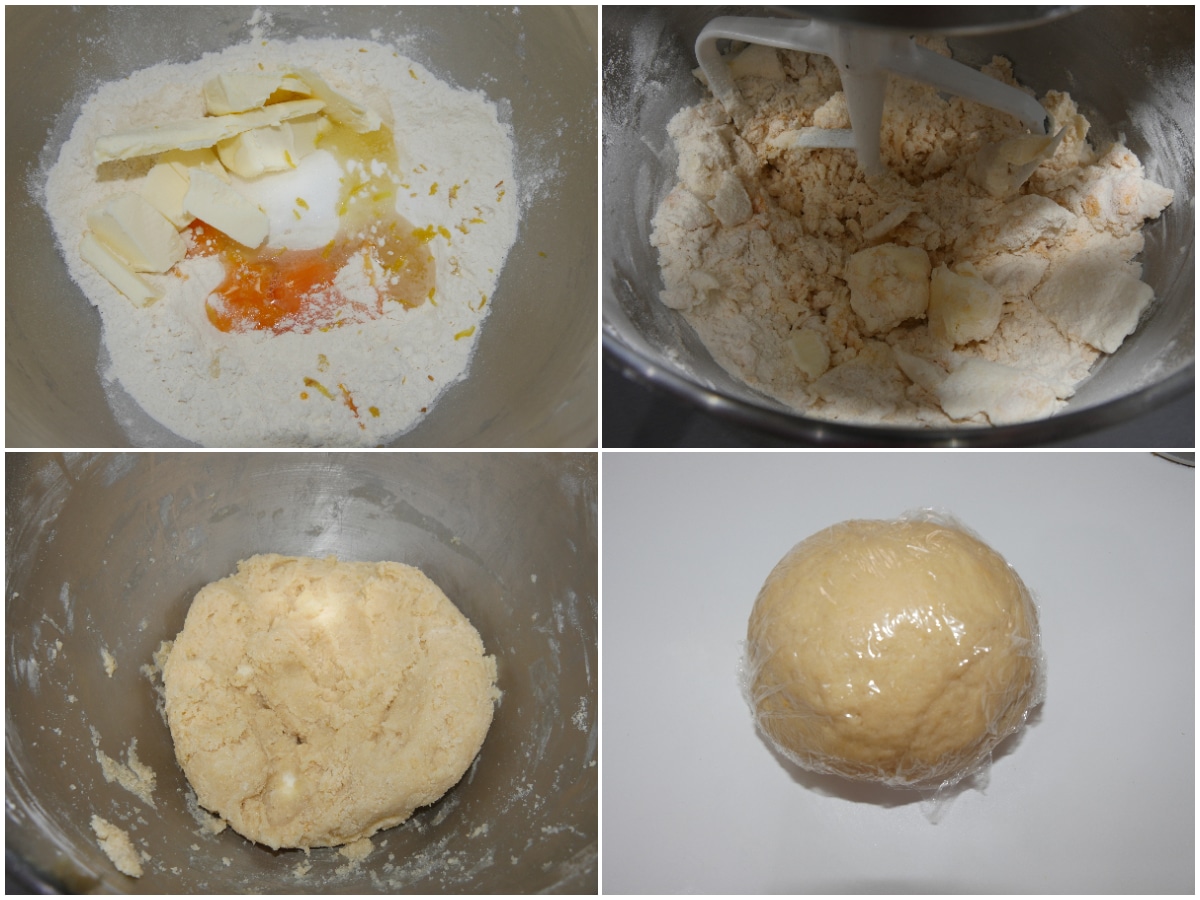 Preparate la frolla: unite tutti gli ingredienti (farina, zucchero, uova, burro freddo a tocchetti, buccia di limone) in una ciotola e lavorate velocemente, fino ad ottenere un panetto omogeneo, quindi avvolgetelo con pellicola per alimenti e fatelo riposare in frigo per almeno 1 ora.
