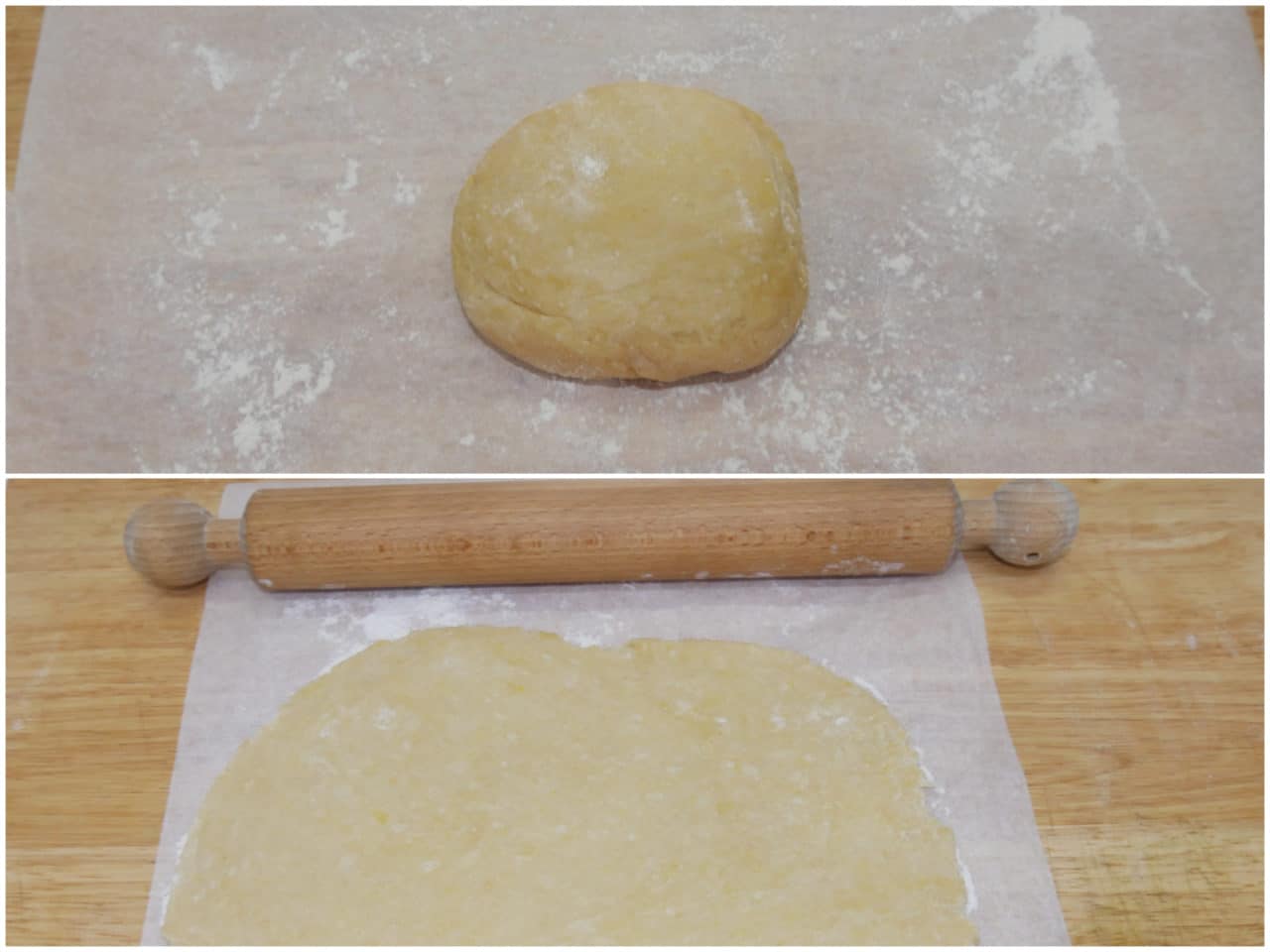 Stendete la frolla sul piano di lavoro leggermente infarinato in una sfoglia sottile (5-6 mm).