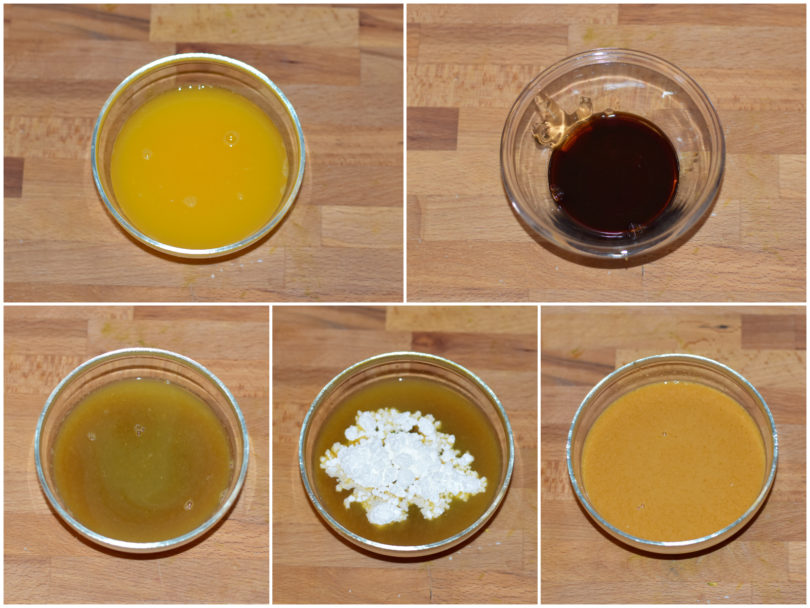 Nel frattempo preparate il condimento mescolando in una ciotolina succo d'arancia, sciroppo d'acero, salsa di soia e maizena.