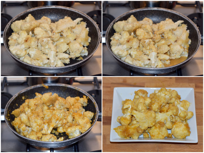 Infine spostate il cavolfiore in una padella antiaderente con poco olio e sfumate con la salsina, cuocendo mescolando, a fiamma media, fino a far addensare il condimento.