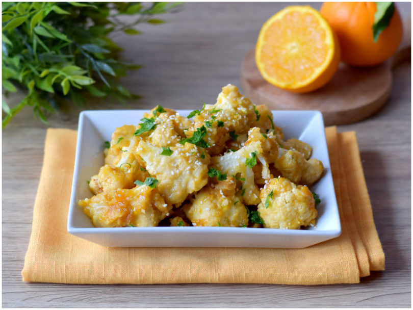 Il cavolfiore all'arancia è pronto, non vi resta che completare con prezzemolo tritato e semi di sesamo e servire.