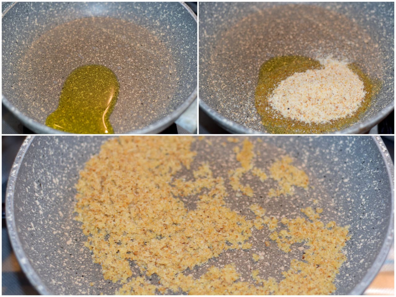Nel frattempo, in un'altra padella, fare dorare il pangrattato con u filo d'olio.