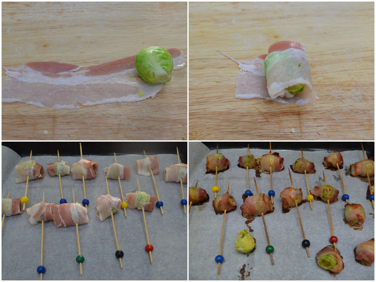 Scolate bene i cavoletti, avvolgeteli nella pancetta e chiudete con uno spiedino.