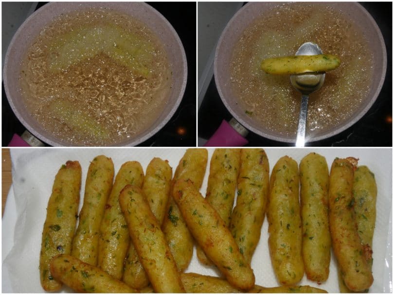 Scaldate l'olio in una padella e cuocete i cazzilli pochi per volta, fino a doratura, quindi sollevatele con una schiumarola, fatele asciugare su carta da cucina e procedete con la cottura delle crocchette rimaste.