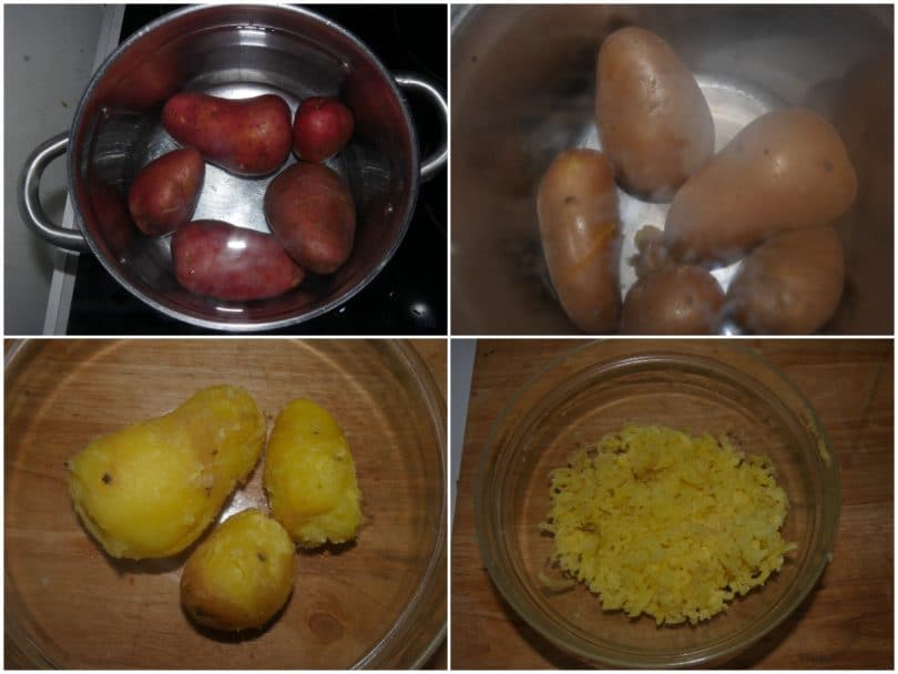 Lavate le patate, lessatele con tutta la buccia finché non si ammorbidiscono (circa 35 minuti), quindi pelatele e schiacciatele.