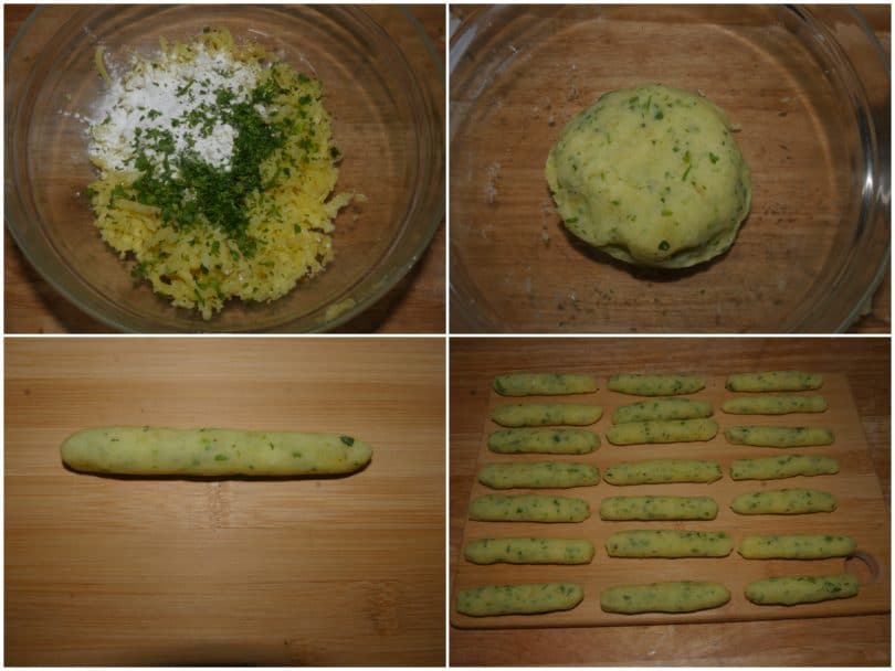 Aggiungete erbe tritate, sale, pepe e fecola e amalgamate, quindi sagomate le crocchette, creando dei salsicciotti lunghi 8-10 cm e larghi 2-3 cm (dovrebbero volerci circa 20 gr di impasto).