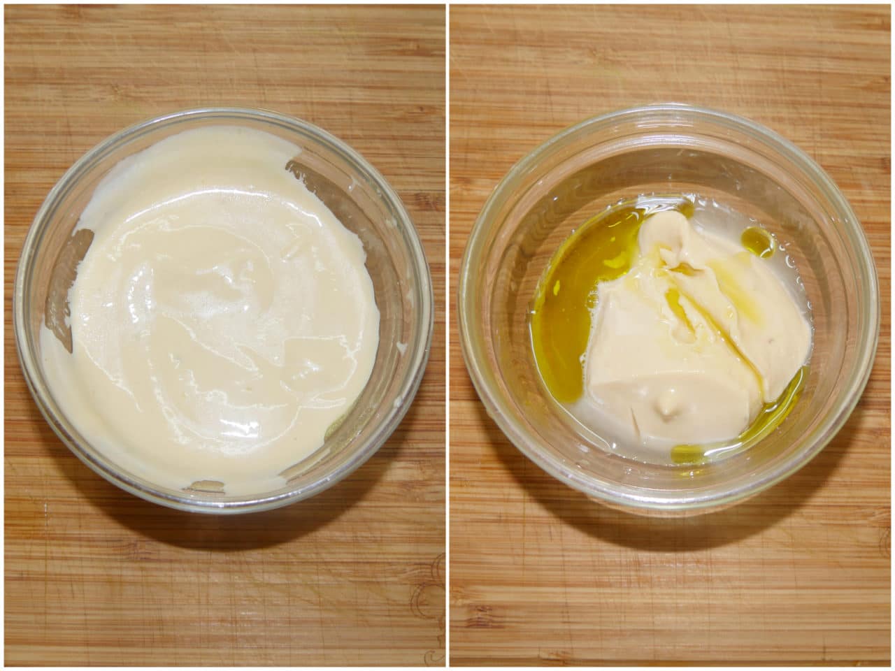 Mettete in una ciotola la salsa tonnata, aggiungete il succo di limone, l'olio e mescolate fino ad ottenere una crema omogenea.