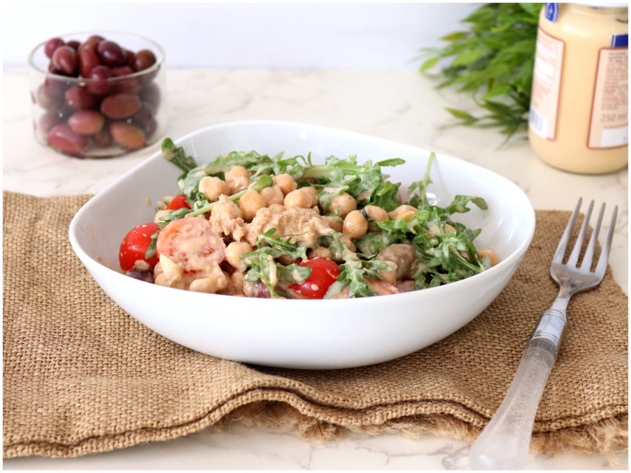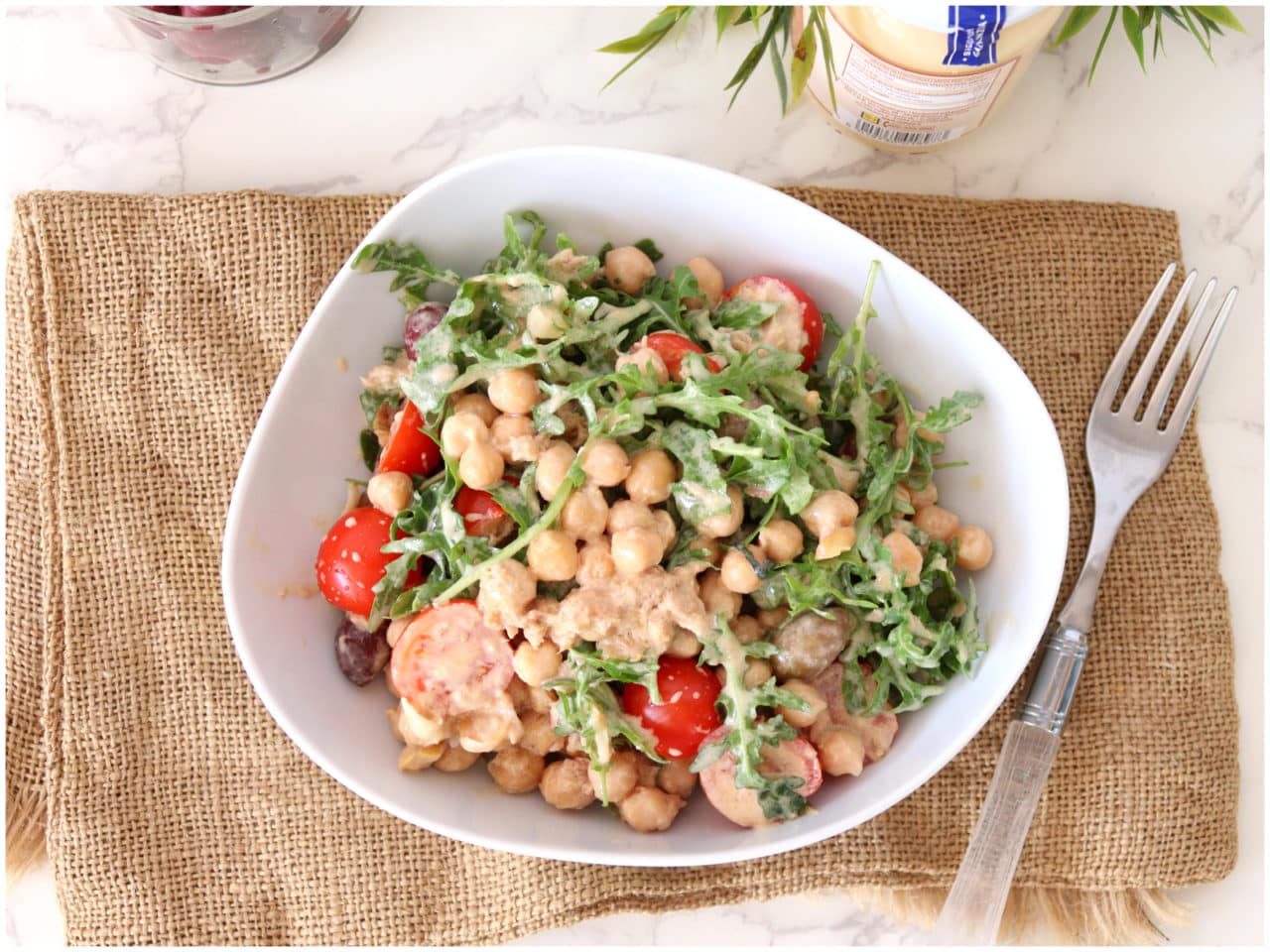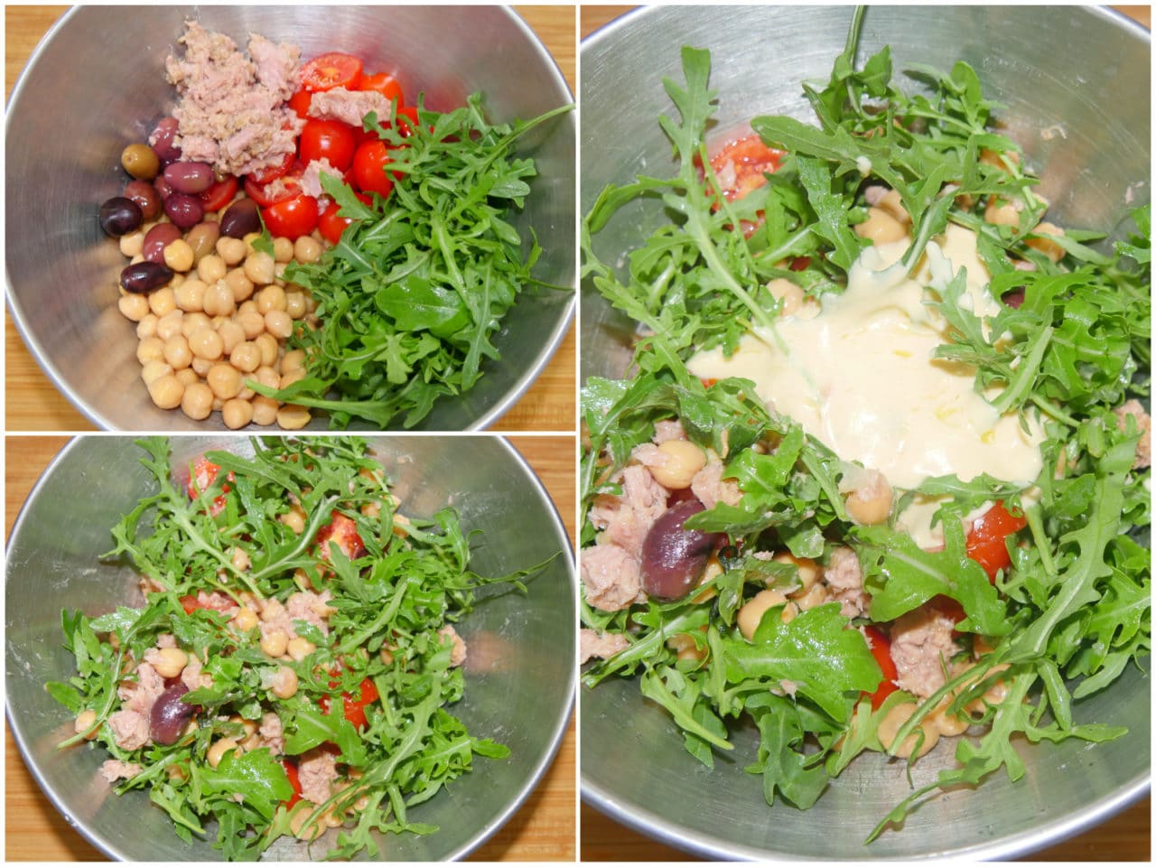 Mettete in un'ampia ciotola i ceci, i pomodorini, aggiungete anche la rucola, il tonno , le olive nere e in ultimo la salsina. ;mescolate con due cucchiai di legno e fate amalgamare per bene tutti gli ingredienti.