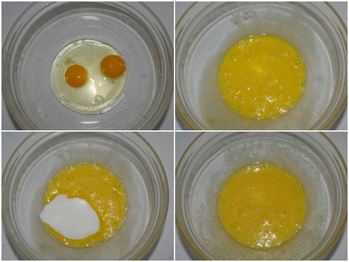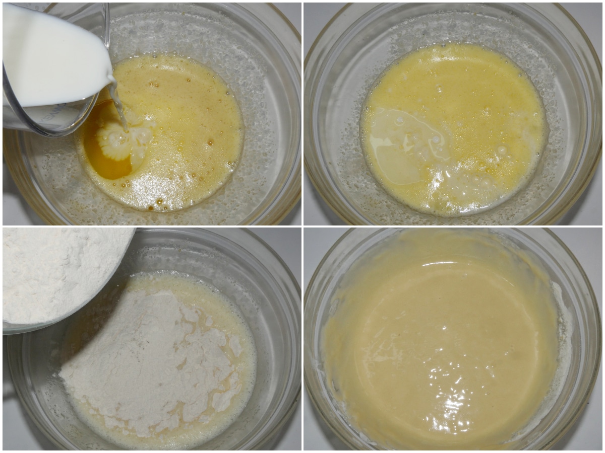 Sbattete le uova con lo zucchero, poi aggiungete olio, latte, farina, sale e lievito.