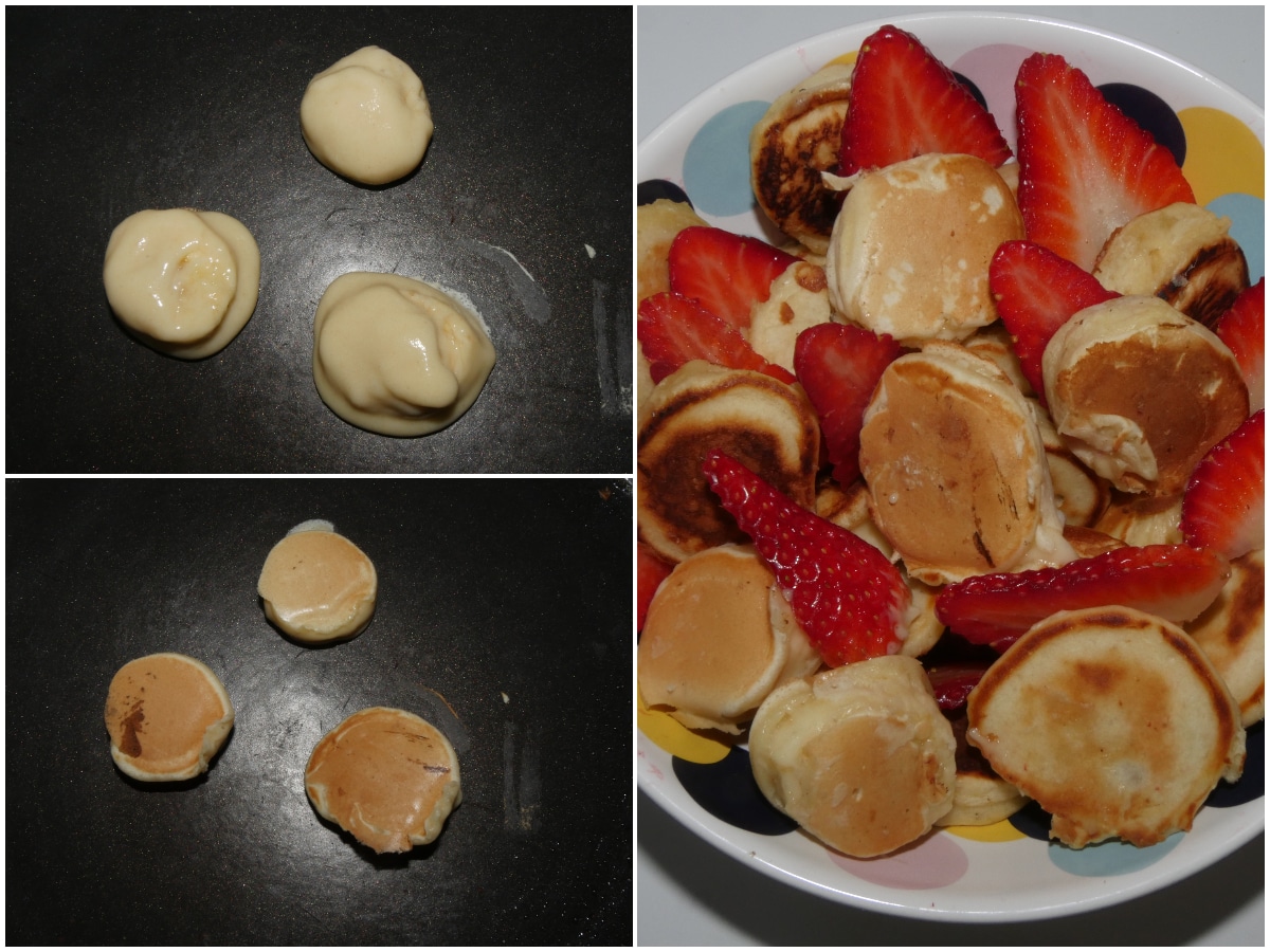 I mini banana pancake sono pronti, guarnite con fragole, zucchero e sciropo o con altri ingredienti a scelta.