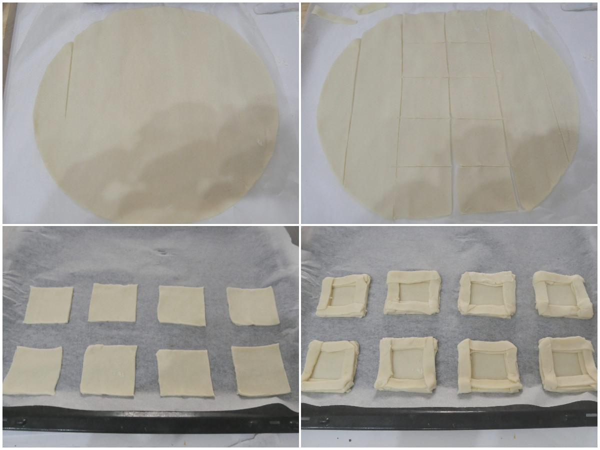 Ricavate dalla pasta sfoglia 8-10 quadratini (di circa 5-6 cm per lato) e adagiateli sulla teglia rivestita di carta forno, quindi con la sfoglia restante create delle striscioline sottili con cui andrete a creare i bordi dei vostri cestini, sovrapponendo 2 striscette per lato, in modo che vengano belli alti.