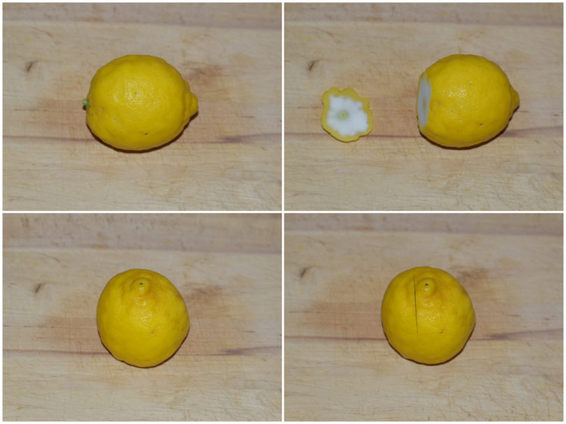 Mettetelo diritto ed effettuate 2 tagli verticali, paralleli tra loro, ai 2 lati della punta allungata, arrivando fino a metà altezza del limone.