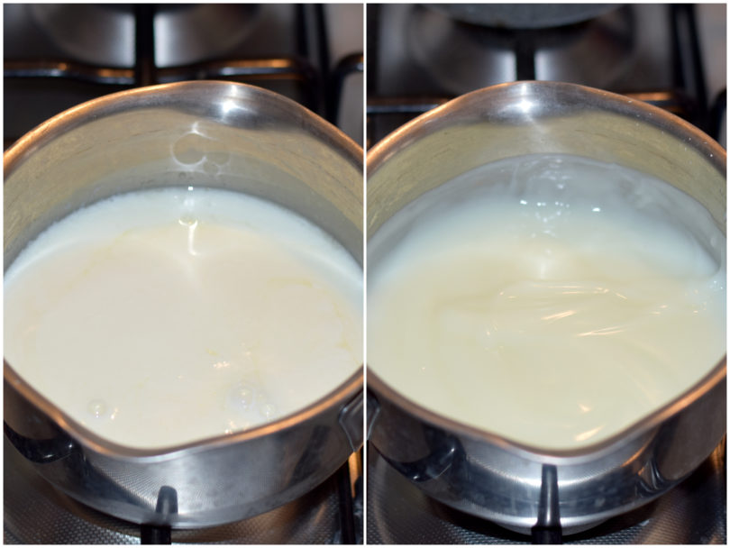 Mettete sul fuoco e cuocete a fiamma bassa, mescolando costantemente, finché non si addensa.