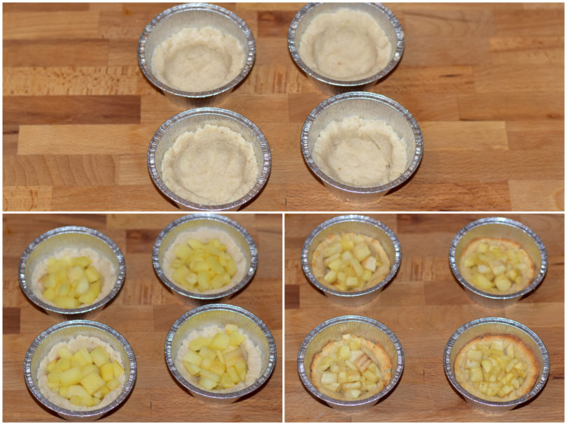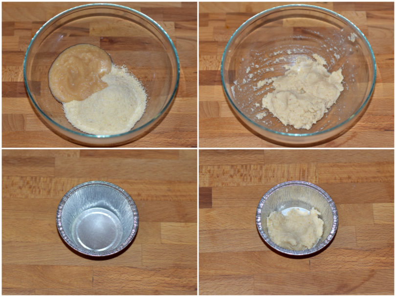 Nel frattempo unite in una ciotola farina di mandorle e purea di mele, dividete il composto nei pirottini e create i cestini sagomandolo con le dita.