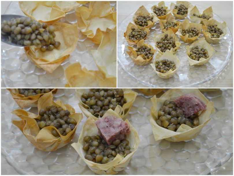 Poco prima di servire, riempite i cestini di fillo con le lenticchie e guarnite con dei pezzetti di cotechino.