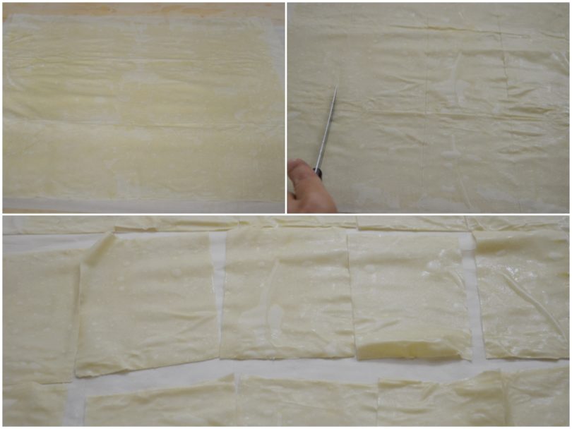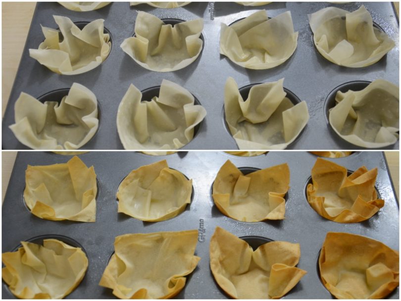 Preparate i cestini di pasta fillo spennellando il primo foglio di fillo con dell’olio. Sovrapponete il secondo foglio di fillo e spennellate anch’esso. Ritagliate dei quadrati regolari di fillo e disponeteli negli stampini a mo’ di cestino.