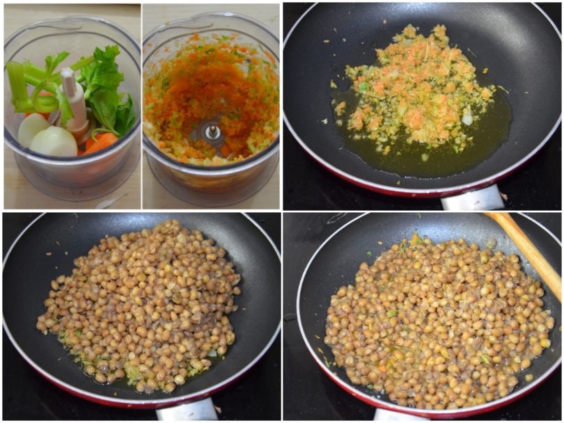 Preparate le lenticchie. Preparate un trito di sedano, carota e cipolla e fatelo soffriggere in padella con l' olio. Aggiungete le lenticchie e salate, aromatizzate con del rosmarino e portate a cottura, pepando a piacere.