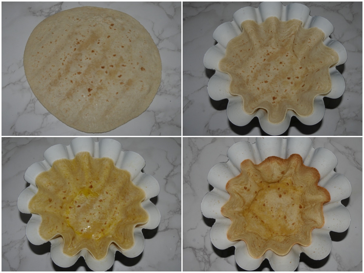 Bucherellate le piadine, inseritele nello stampo che avete scelto e spennellatele con olio, quindi cuocete per 5-10 minuti (a me ce ne sono voluti circa 7-8) a 180°C, in forno ventilato già caldo, poi sfornate e lasciate raffreddare nello stampo.
