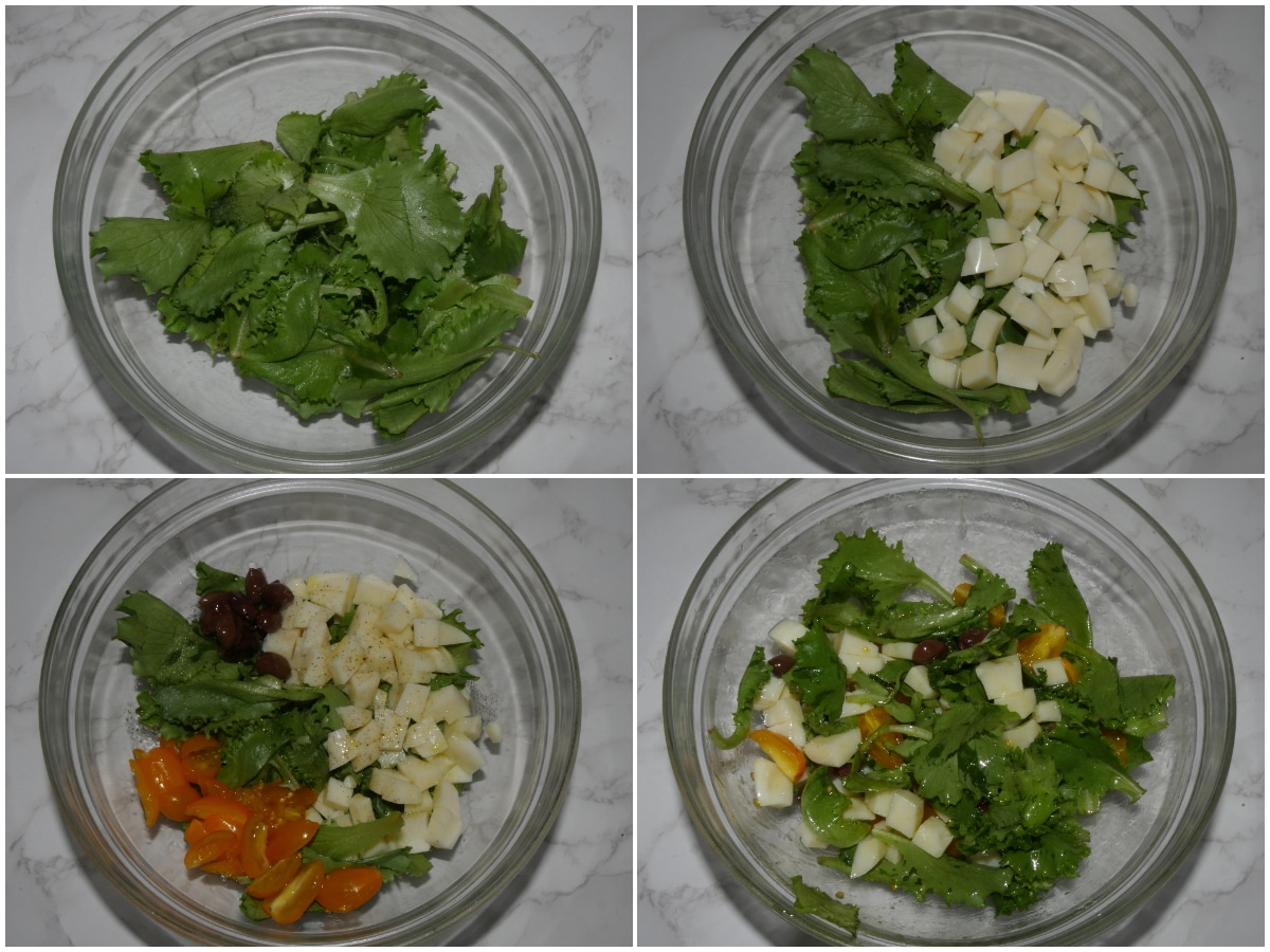 Preparate l'insalata: mettete in una ciotola lattughino lavato e ben sgocciolato, formaggio a tocchetti, olive denocciolate, pomodorini lavati e tagliati, sale e olio e mescolate.