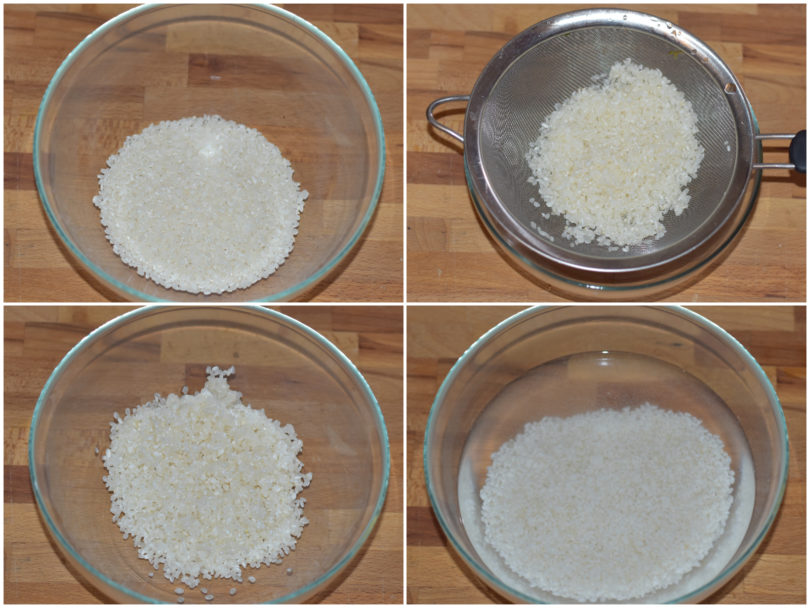 Innanzitutto occupatevi del riso: sciacquatelo bene sotto acqua corrente finché l'acqua non risulterà limpida, poi lasciatelo riposare in acqua fredda per 15 minuti.