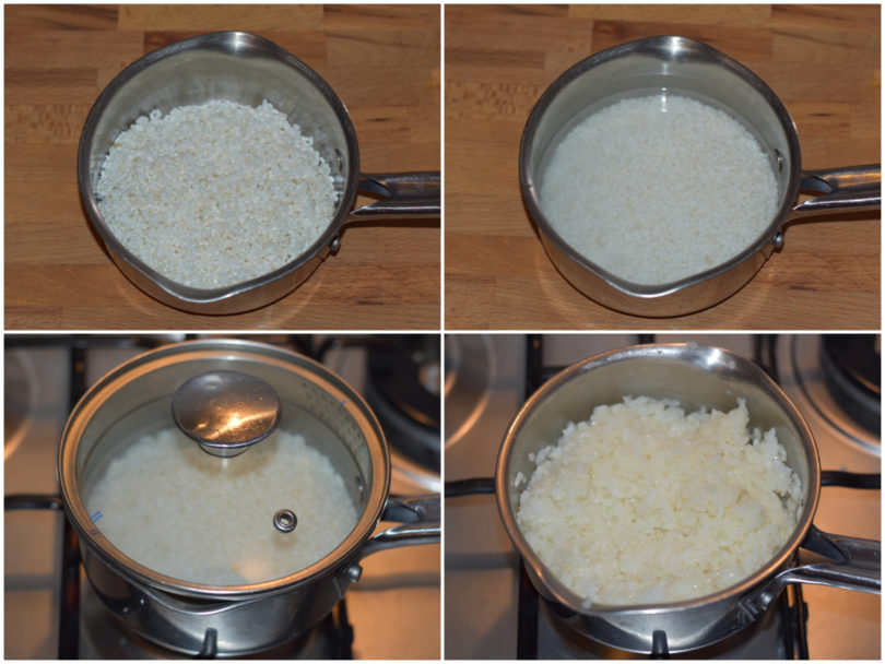 Mettetelo quindi in un pentolino, coprite con l'acqua (il peso dell'acqua deve essere 1 volta e mezzo il peso del riso, quindi in questo caso 240 ml), aggiungete un pizzico di sale e mettete sul fuoco con coperchio, lasciando cuocere finché non avrà assorbito tutta l'acqua.