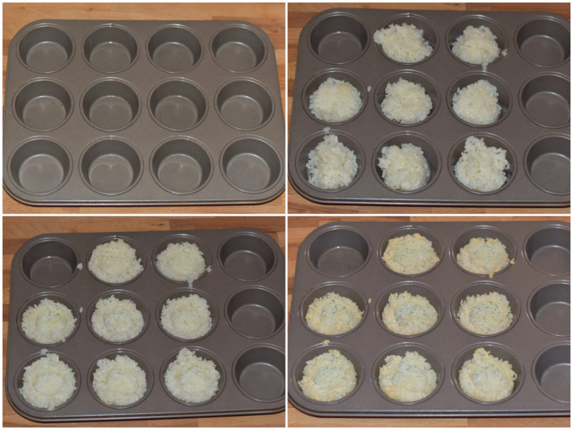 Ungete leggermente gli stampini per muffin, mettete 1 cucchiaio di riso in ogni stampino e poi schiacciate al centro con una tazzina da caffè, in modo da creare dei cestini.