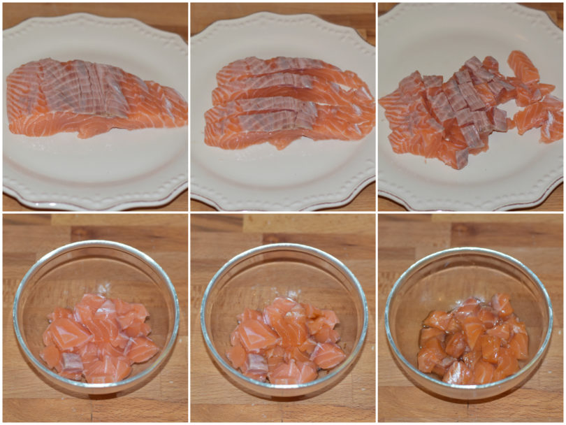 Nel frattempo tagliate il salmone a cubettini (mi raccomando, deve essere pesce già abbattuto), conditelo con la salsa di soia e lasciatelo marinare.