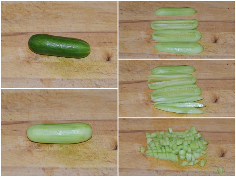 Intanto preparate gli altri ingredienti: mondate il cetriolo e tagliatelo a cubettini.